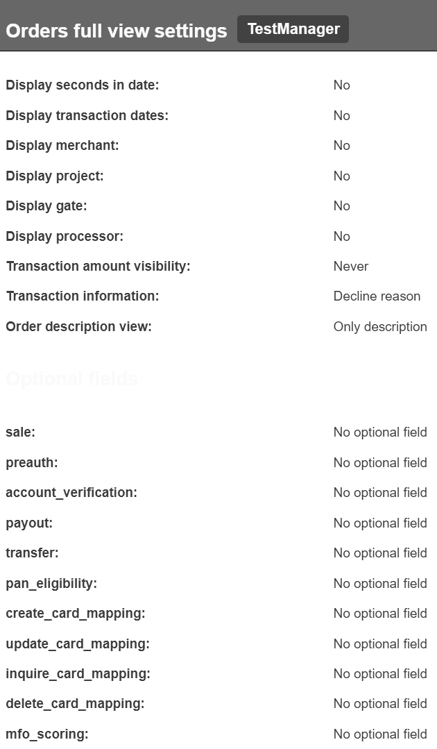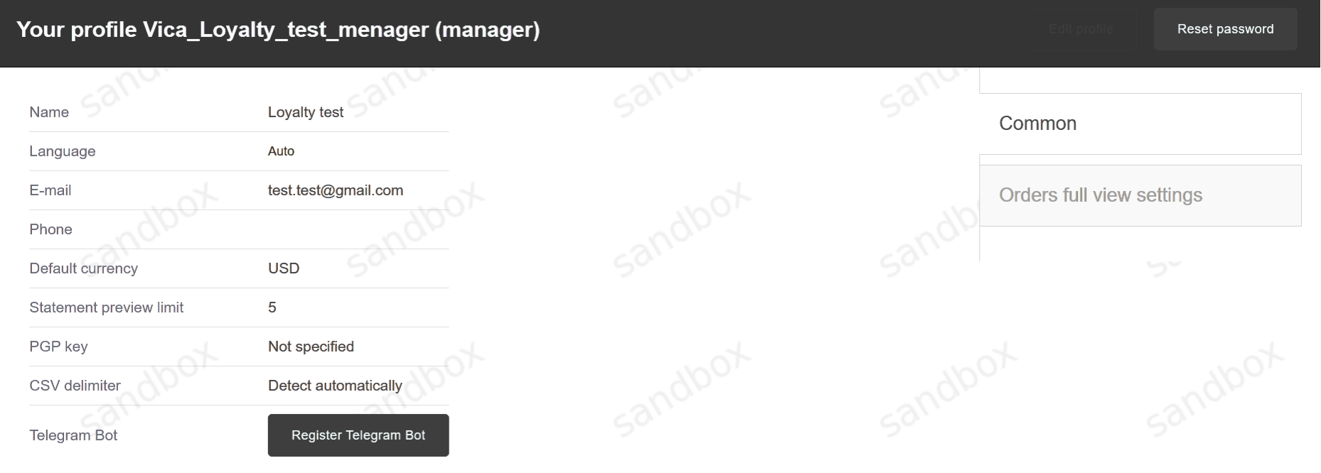 By clicking on Manager name on the top left side of header you will be redirected to user profile where you can setup your profile. From the right side of page you will see to pages Common and Orders full view settings:
