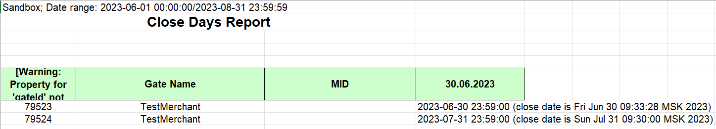 Displays the exact time when the close day procedure for settlement was performed on each gate.