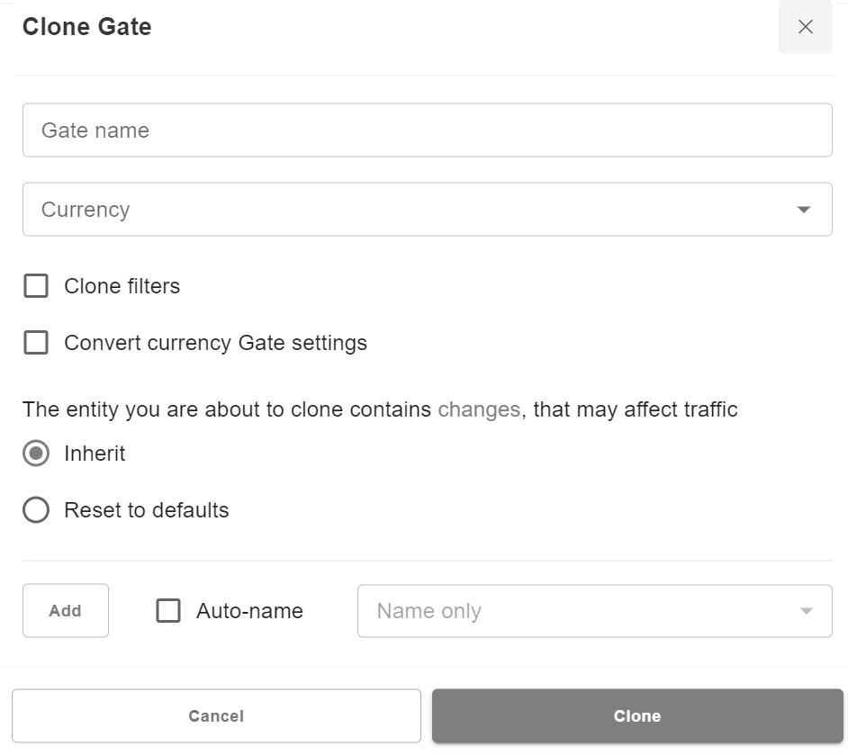 Gates are cloned for the same processor. The required parameters for new gate are its name and currency.
