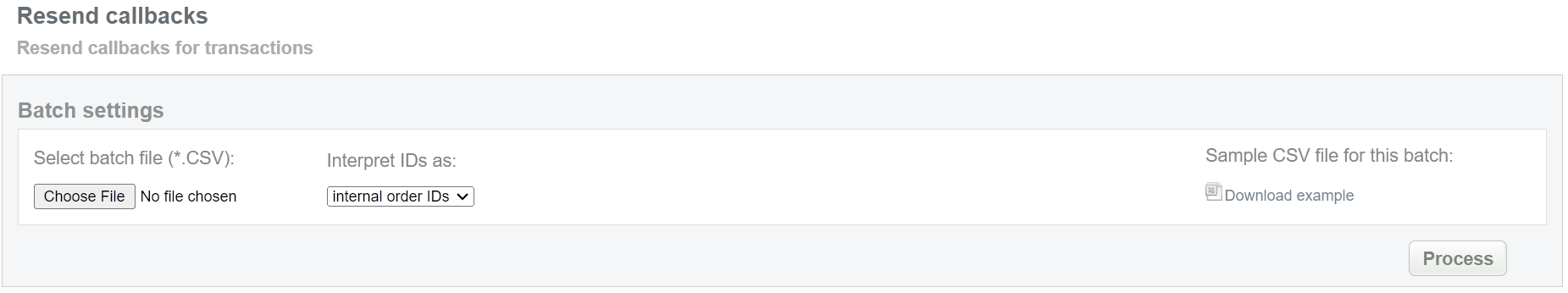 This batch operation can be useful if information on the final status of transactions is available in Crederes system and for some reason is not available in the Connecting Party system. Collect the order IDs, assigned by Crederes system to the CSV file and upload it to send new callback notifications. An example of CSV file for upload is available on the same screen.
