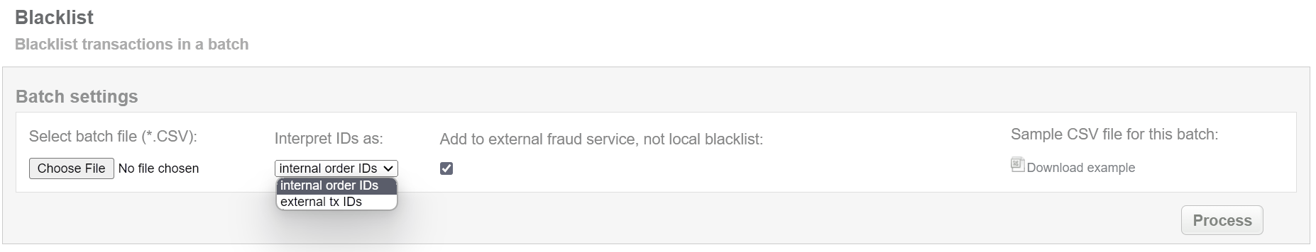 This batch operation, in according to specified input, puts cards in blacklist or external fraud system if such is set up. Collect the order IDs, assigned by Crederes system to the CSV file and upload it to blacklist card of selected transactions. An example of CSV file for upload is available on the same screen.