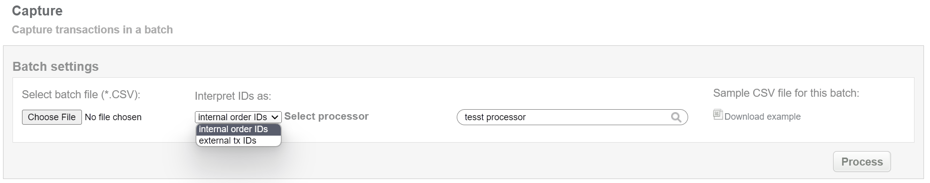 This batch operation can be useful for deducting the locked amount from preauth transactions (preauth should be in approved final status) in according to specified input. Collect the order IDs, assigned by Crederes system to the CSV file and upload it to make capture of selected transactions. An example of CSV file for upload is available on the same screen.