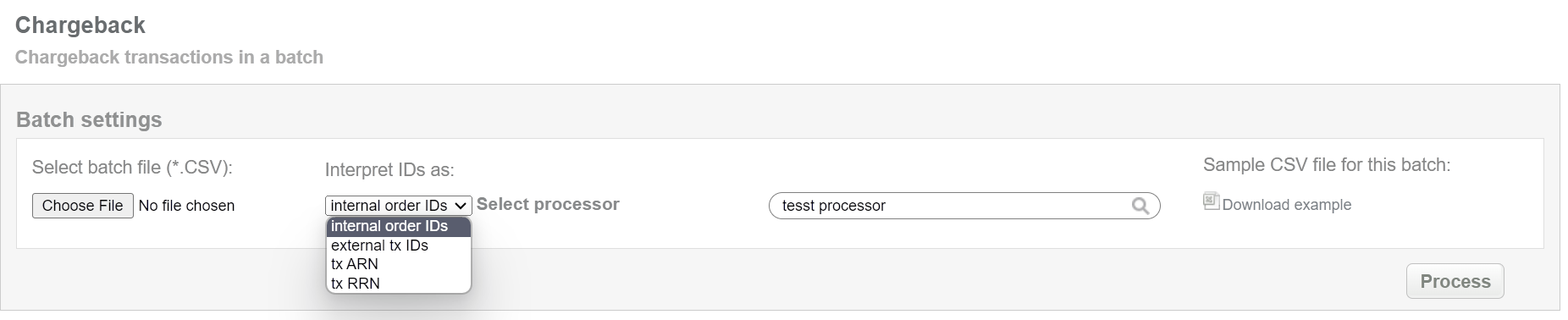 This batch operation can be useful if for some reason reversal was not made to prevent a chargeback and creating chargeback transaction according to specified input is needed. Collect the order IDs, assigned by Crederes system to the CSV file and upload it to make chargebacks for selected transactions. An example of CSV file for upload is available on the same screen.