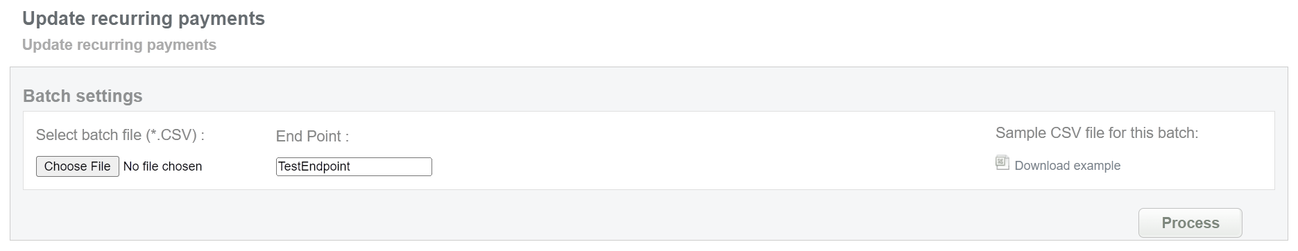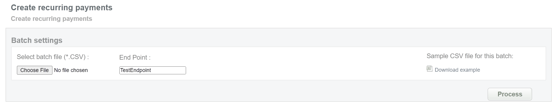 This batch operation can be useful for initiating recurring payments for transactions that require regular debits with the same data. Collect the order IDs, assigned by Crederes system and enter all information to the CSV file and upload it to create recurring payments. An example of CSV file for upload is available on the same screen.
