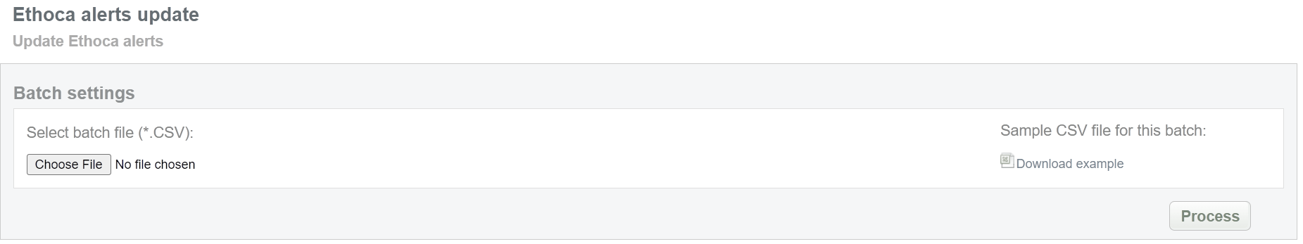 This batch operation can be useful for updating Ethoca statuses. Collect the order IDs, assigned by Crederes system to the CSV file and upload it to send statuses to Ethoca system. An example of CSV file for upload is available on the same screen.