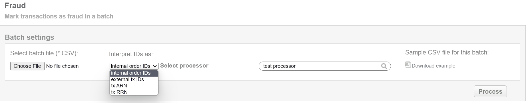 If Connecting Party suspects transaction to be fraudulent, then this batch operation can be useful for marking transactions as fraud in according to specified input. Collect the order IDs, assigned by Crederes system to the CSV file and upload it to mark selected transactions as fraud. An example of CSV file for upload is available on the same screen.