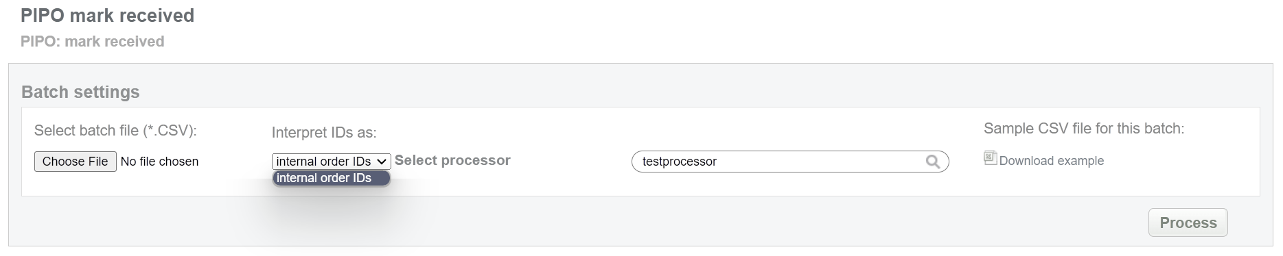 This batch allows to mark pending bank transfer as received. This status equals to “approved” for preauth transaction. Collect order IDs, assigned by Crederes system and enter all information to the CSV file and upload it to mark PIPO payments as received. An example of CSV file for upload is available on the same screen.