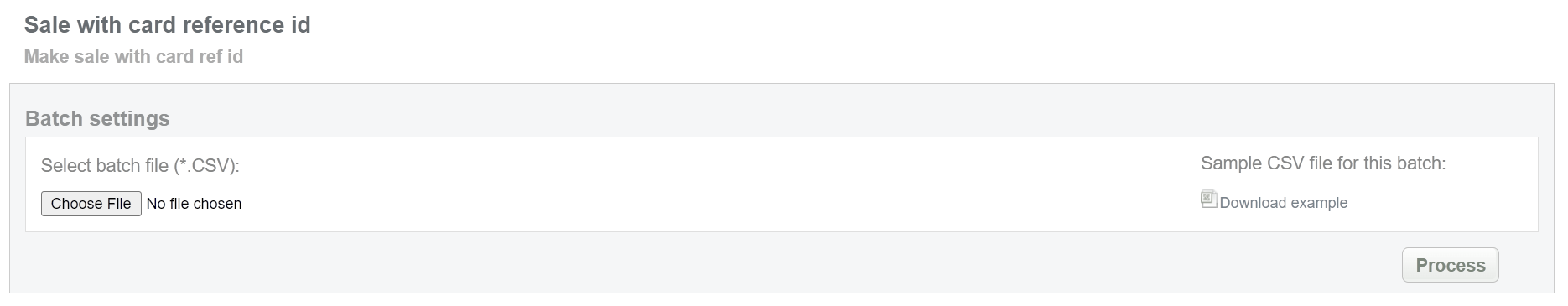 This batch operation can be useful for initiating sale without any card information using only card reference ID. Collect the Endpoint and Card reference IDs, assigned by Crederes system and enter all information to the CSV file and upload it to initiate sale transactions with card reference ID. An example of CSV file for upload is available on the same screen.