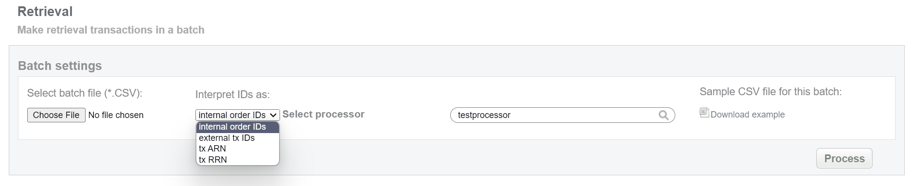 This batch operation can be useful for uploading a copy of the sales ticket to support or identify a potential chargeback. Collect the order IDs, assigned by Crederes system and enter all information to the CSV file and upload it to add retrieval information. An example of CSV file for upload is available on the same screen.