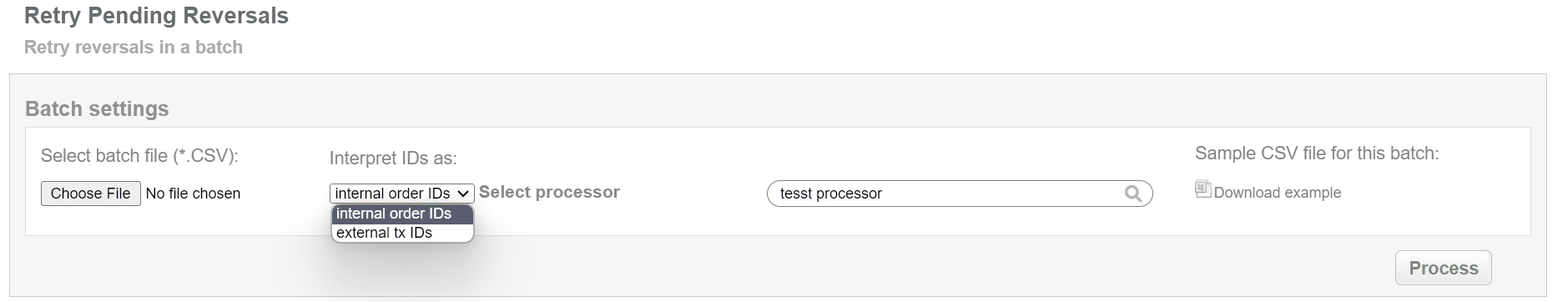 This batch operation re-sends reversal request for pending reversals in according to specified input. Collect the order IDs, assigned by Crederes system to the CSV file and upload it to make reversal of selected transactions. An example of CSV file for upload is available on the same screen.