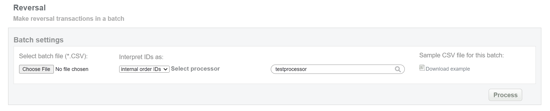 This batch operation can be useful for initiating reversal transactions in according to specified input. Collect the order IDs, assigned by Crederes system to the CSV file and upload it to make reversal of selected transactions. An example of CSV file for upload is available on the same screen.
