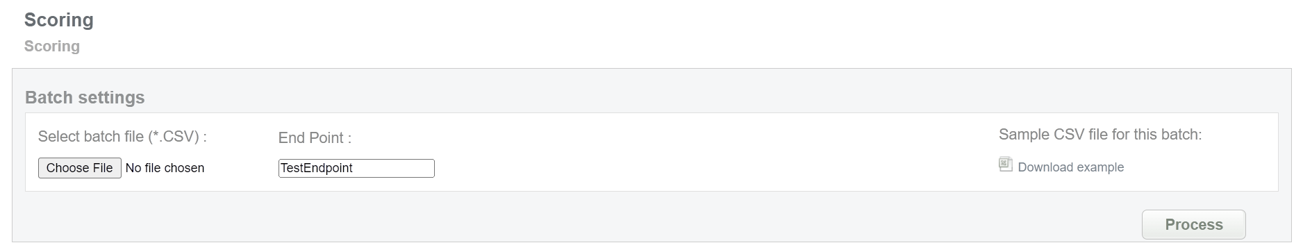 This batch allows to get information about card scoring. Collect order IDs and needed card data, assigned by Crederes system and enter all information to the CSV file and upload it to receive card scoring information. An example of CSV file for upload is available on the same screen.