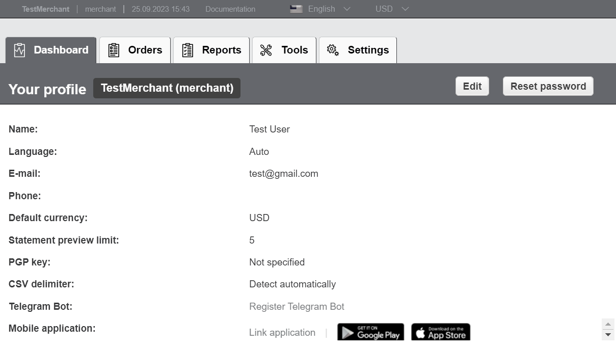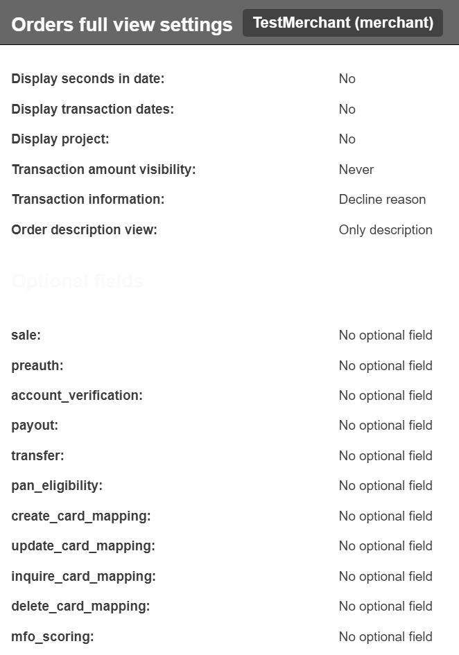 By clicking on Merchant name on the top left side of header menu you will be redirected to user profile with two profile configuration tabs on the right side of the page: “Common” and “Orders full view settings”: